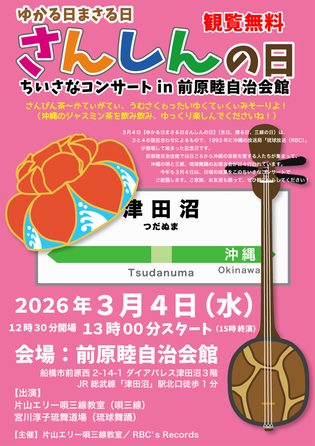 3月4日は沖縄の放送局RBCiラジオさんが提唱する「ゆかる日まさる日さんしんの日」です。我が片山エリー唄三線教室ではこれに賛同させていただくかたちで、毎年自主開催のイベントを行っています。今年も宮川淳子琉舞道場の皆さんと一緒に3月4日の昼間にちいさなコンサートを開催いたします。平日ではありますが、ぜひご来場ください。入場ご観覧無料でお待ちしております。
